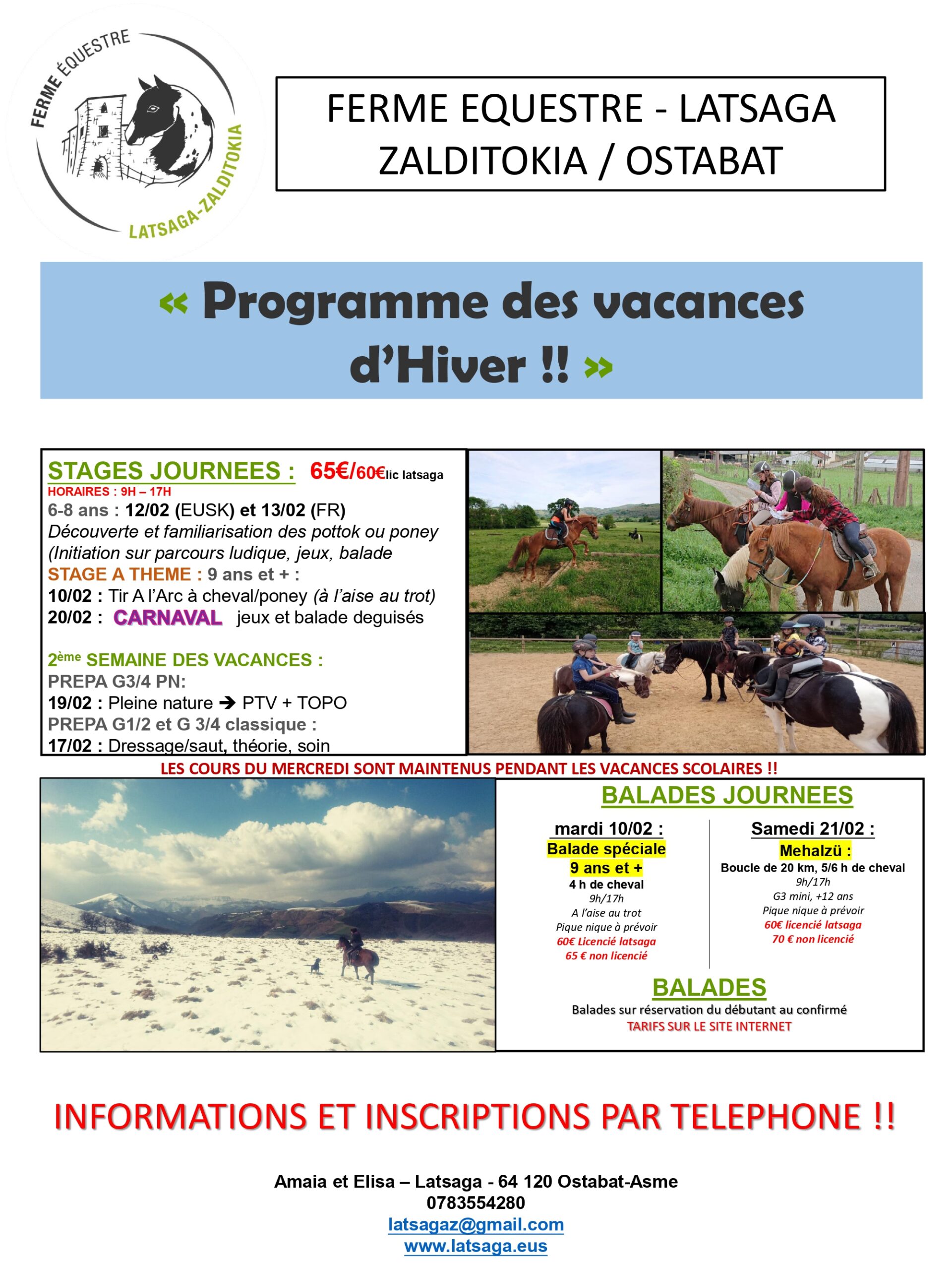 Après 2 mois de vacances bien mérité dans 70 hectares de landes à la forêt d’ostabat, les poneys et chevaux de Latsaga sont de retour à la ferme pour la reprise des cours. La ferme ré ouvrent ses portes début février pour les cours mais aussi pour les vacances de février qui arrivent au grand galop!!